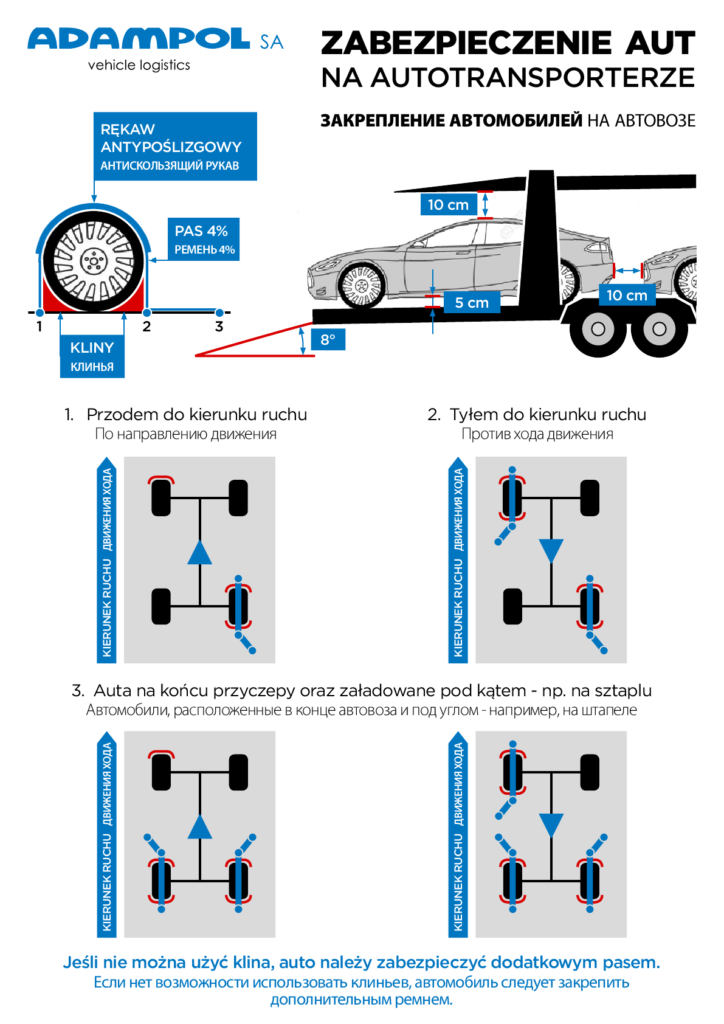 - Auta załadowane na końcu autotransportera lub pod kątem powinny być dodatkowo przymocowane na drugim kole ostatniej osi przy pomocy dwóch klinów i jednego pasa. mocujących z rękawami.